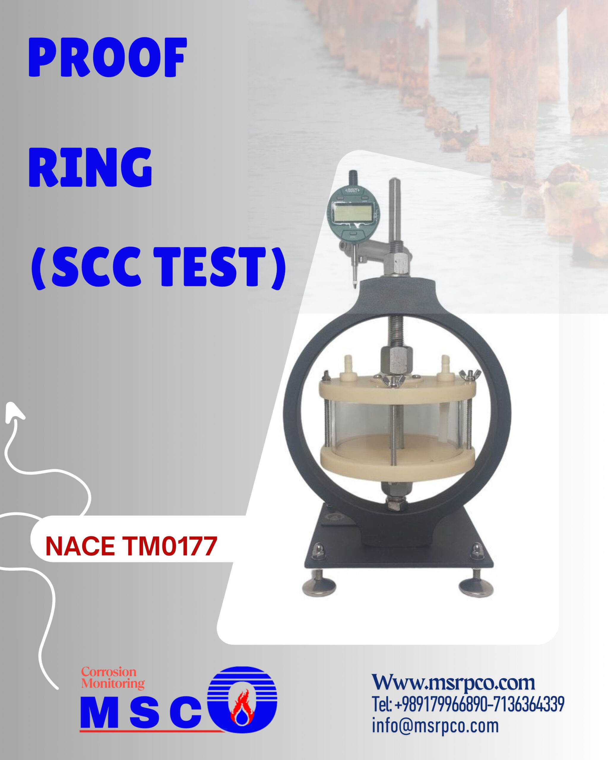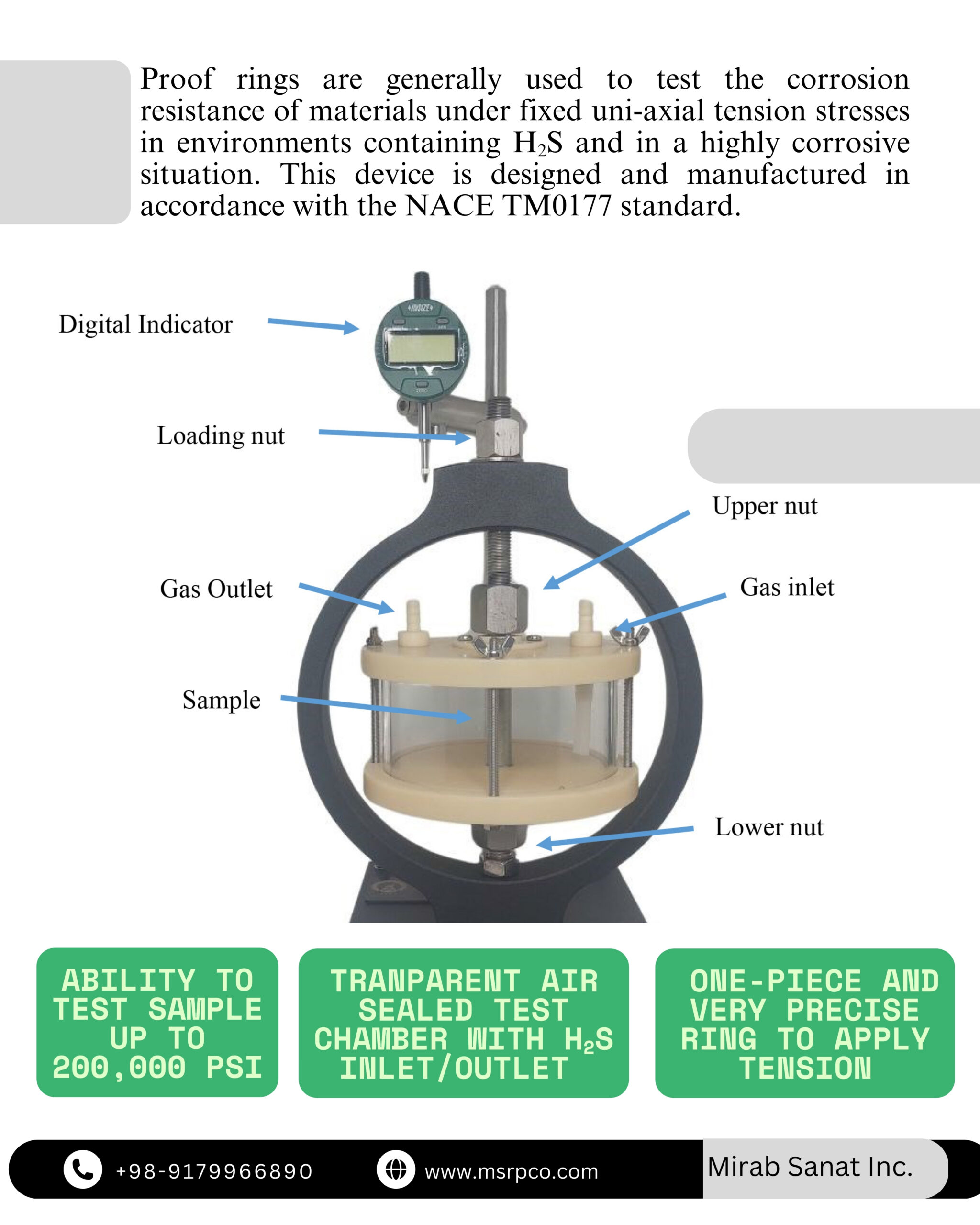 پروف رینگ (proof ring) عموما به منظور بررسی مقاومت به خوردگی تحت تنش مواد (sulfide stress corrosion) در محیط های حاوی H2S و محیط های بسیار خورنده استفاده می شود. این دستگاه مطابق با استاندارد NACE TM0177 طراحی و ساخته شده است. این آزمون روشی دقیق و کم هزینه با قابلیت انجام سریع آزمون در محیط خورنده می باشد. این دستگاه امکان اعمال نیروی ثابت کششی تک محوره (uniaxial tensile) و در محیط خورنده را فراهم می کند. در این تست نمونه تا تنش مشخصی تحت کشش قرار گرفته و سپس تاثیر محیط خورنده بر رفتار ماده بررسی می شود. جنس بدنه دستگاه از شیشه شفاف نشکن از جنس اکریلیک می باشد و دستگاه دارای ورودی و خروجی گاز می باشد.